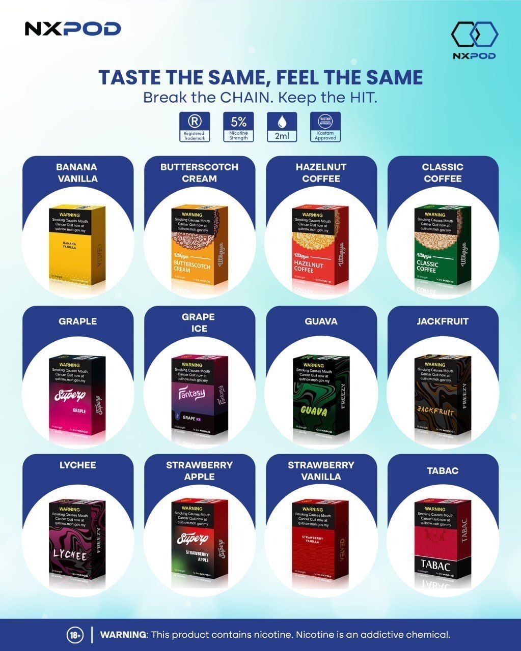 | FLAVOUR | BANANA VANILLA, BUTTERSCOTCH CREAM, HAZELNUT COFFEE, CLASSIC COFFEE, GRAPLE, GRAPE ICE, GUAVA, JACKFRUIT, LYCHEE, TABAC, STRAWBERRY VANILLA |